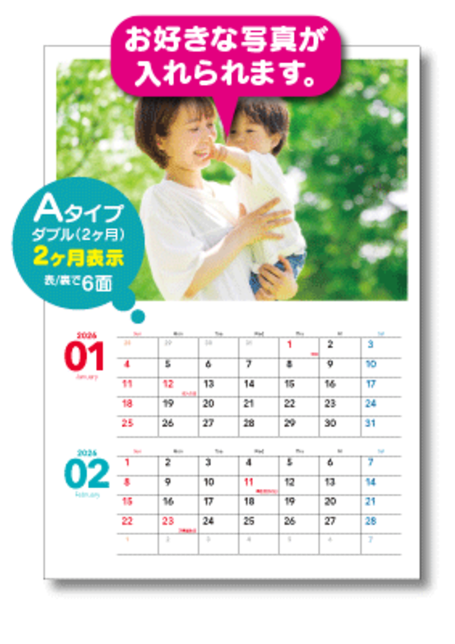 お気に入りの写真やイラストでオリジナルのカレンダーが1冊から作れます。 家族の写真や大切なペットの写真、オリジナルのイラストなどもOK!プレゼントにも最適です。世界に一つだけのオリジナルカレンダーを作りましょう。 【カレンダー作成の流れ】 ご注文確定➡お写真またはイラスト等のデータを入稿➡印刷データご確認➡校了➡カレンダー作成➡発送 ※カレンダー注文ガイドをご覧になり、データ入稿をお願いいたします。 ■名入れも承ります! ・名入れをご希望の方はご注文の際にご入力ください。 書体はオプションにてお選びください。色は黒のみとなります。 ・その他、ご希望やご指定がありましたら「有料名入れ」をご購入ください。 ■ カラー/サイズ - サイズ: A3(420mm x 297mm) ※壁掛け、中綴じ仕様 - カラーバリエーション: フルカラー ■ 素材 - 当社在庫紙を使用。その分お安くなっております! ※主にコート紙 ■ 発送・注文に関する情報や注意事項 - 校了から発送まで通常5営業日以内に発送いたします。 - 配送業者はお選びいただけませんが、迅速にお届けいたします。 ■ その他の情報や注意事項 - 「カレンダー注文ガイド」や「データ入稿について」をよくお読みになってからご注文ください。 - 商品に関するご不明点は、お気軽にお問い合わせください。 【重要】ご入稿いただく全ての画像データは、お客様ご自身が著作権を保有されているか、または著作権者から利用の許諾を得ているものに限ります。著作権、肖像権、商標権、その他の権利を侵害する恐れのある画像、または公序良俗に反する画像での作成はお受けできませんので、予めご了承ください。 オリジナルカレンダーで、日々をあなたらしく演出しましょう。詳しい情報やご注文はショップのお問い合わせからお気軽にご連絡ください。