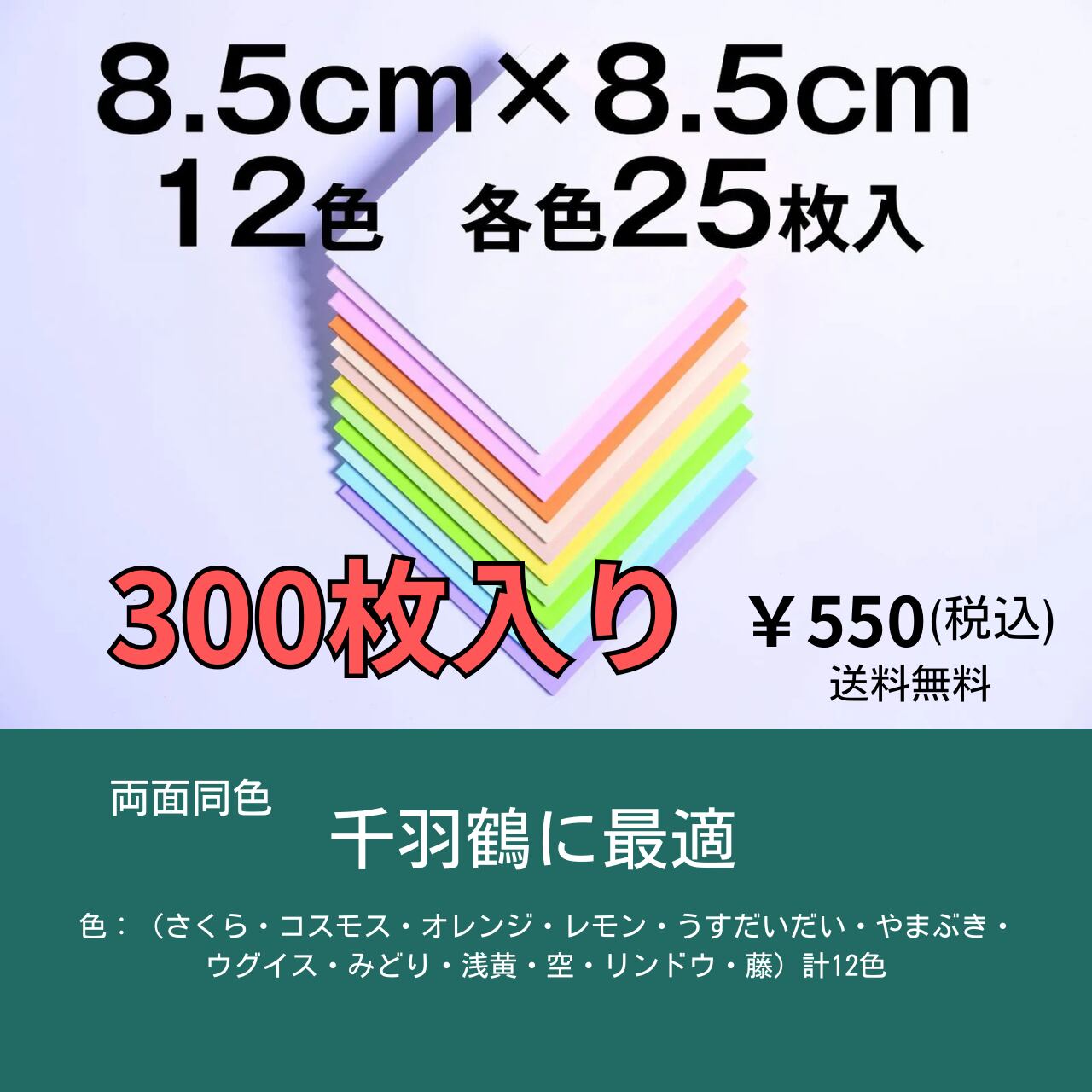 【お徳用】両面同色 千羽鶴サイズ 折り紙セット 12色入り 8.5cm角 各色25枚入り 合計300枚セット